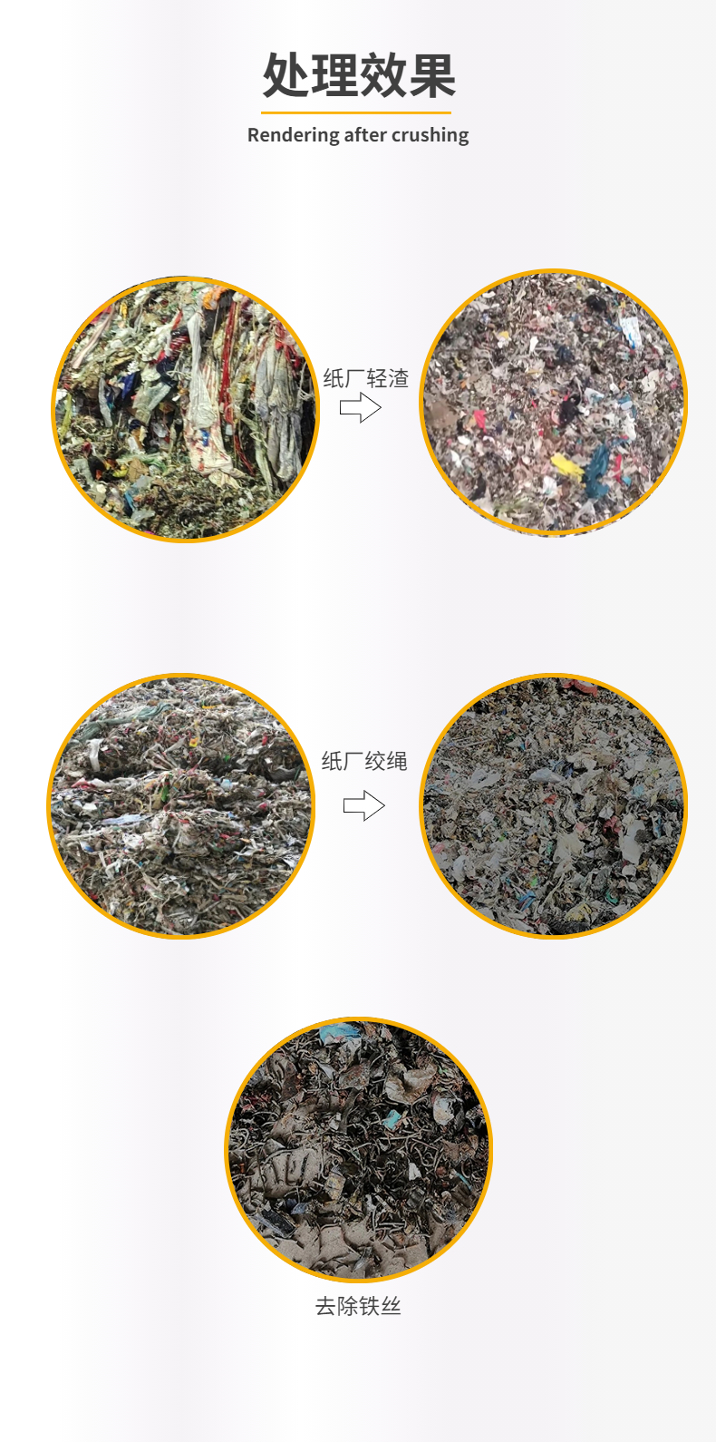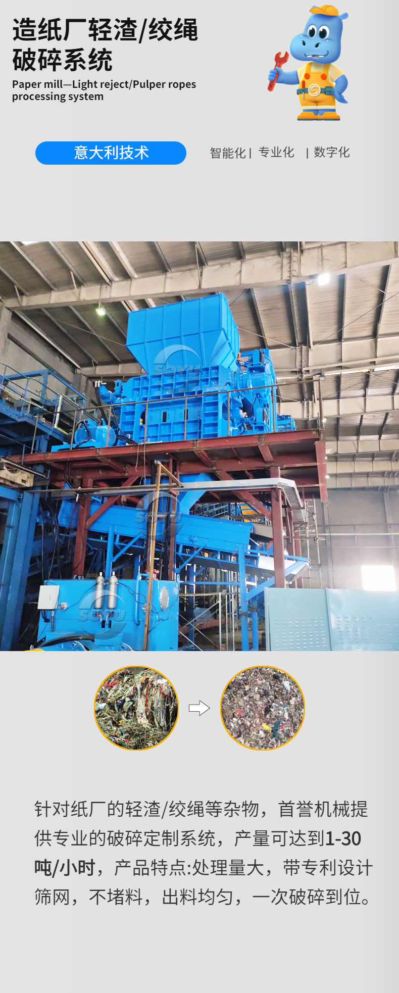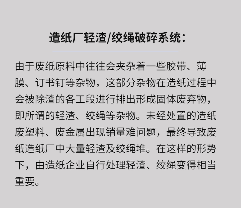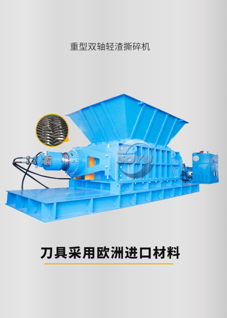 專業(yè)針對紙廠輕渣,絞繩等廢棄物而設(shè)計,整機技術(shù)來源于歐洲,采用微電腦(PC)自動控制,設(shè)啟動、停止、反轉(zhuǎn)及超載自動反轉(zhuǎn)控制功能,具有低速、大轉(zhuǎn)矩、低噪音等特點,軸承座采用對開型式,拆裝換刀容易方便適合撕碎特大、特厚難碎物料。